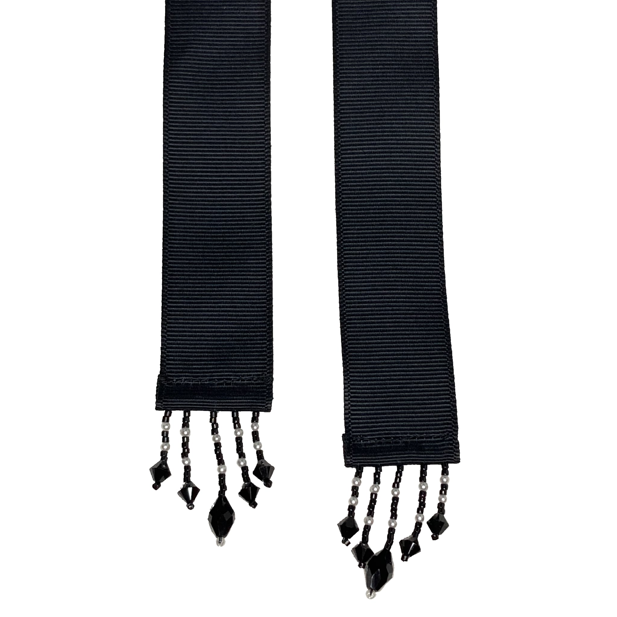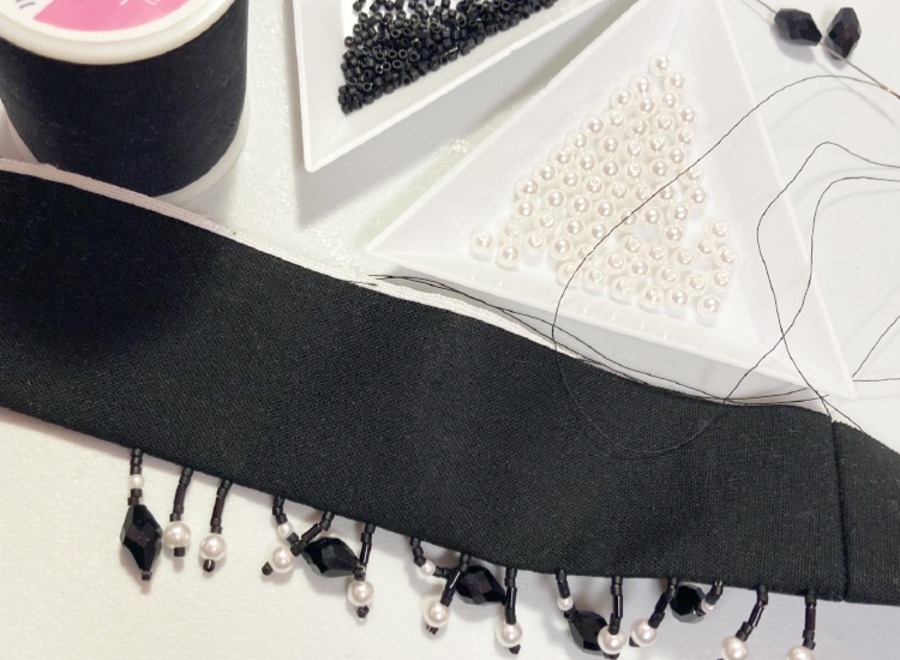 リボンのビーズフリンジは全て手作業で縫い付けております。