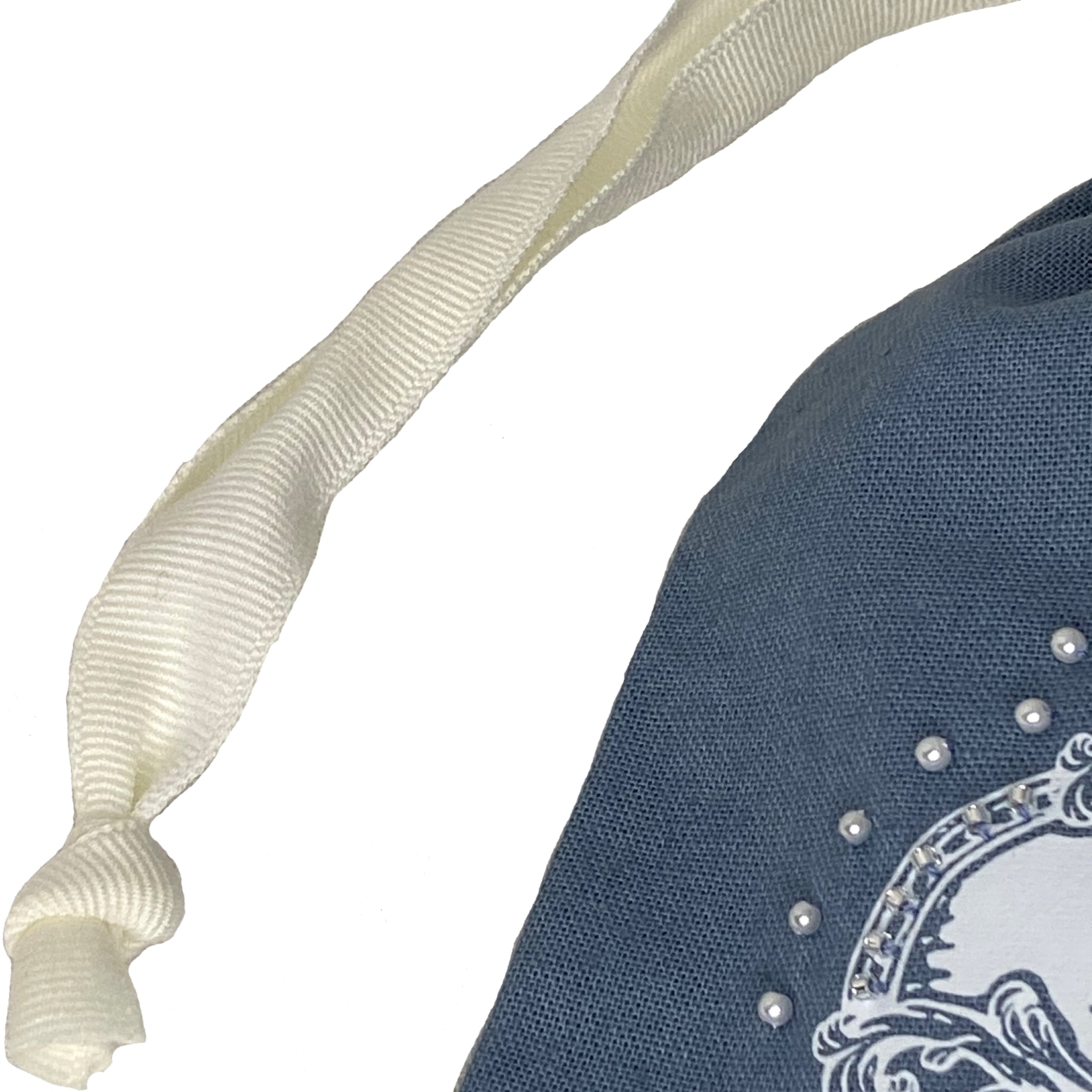 スモークブルー×ホワイト×シルバービーズのノーブルな色合わせも可愛いポーチです。